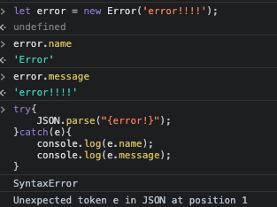내장 에러 전체와 에러 객체는 두 가지 주요 프로퍼티를 가집니다.