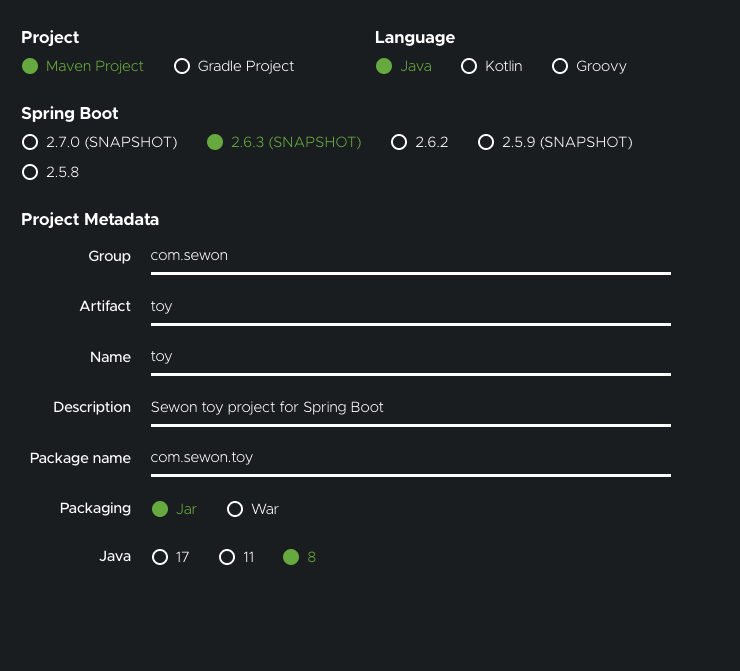 위 링크로 접속을 해서 만들고자 하는 프로젝트의 자바 버전, 스프링부트 버전, 언어, maven/gradle 등을 선택해서 만들면 됩니다.