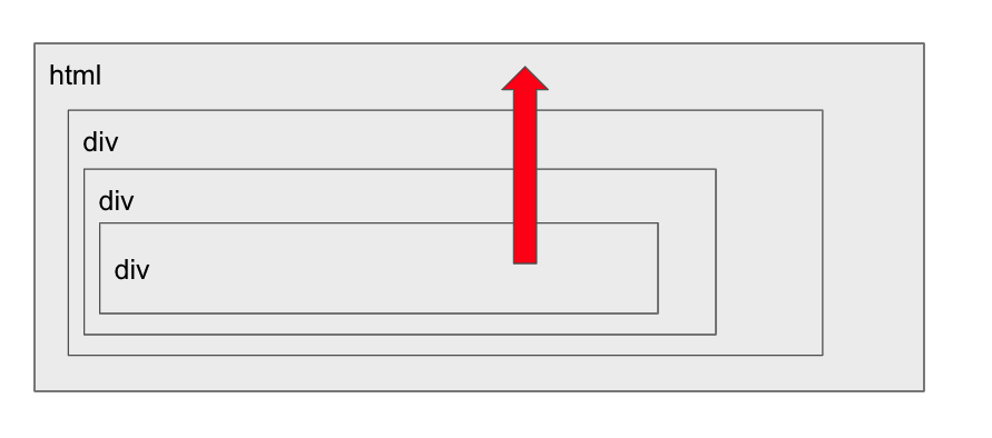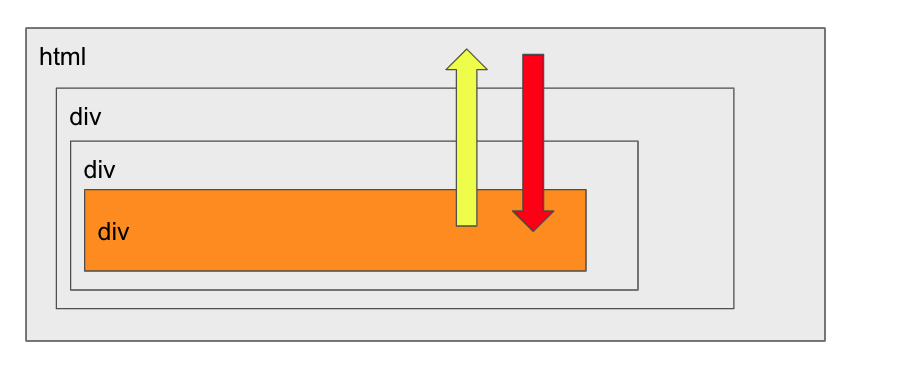 최하위 div를 클릭하면 이벤트가 최상위 조상에서 시작해서 아래로 전파되고(빨간부분, 캡처링 단계), 이벤트가 타깃 요소에 도착해 실행된 후(주황부분,타깃 단계), 다시 위로 전파됩니다(노랑부분,버블링 단계). 이런 과정을 통해 요소에 할당된 이벤트 핸들러가 호출됩니다.